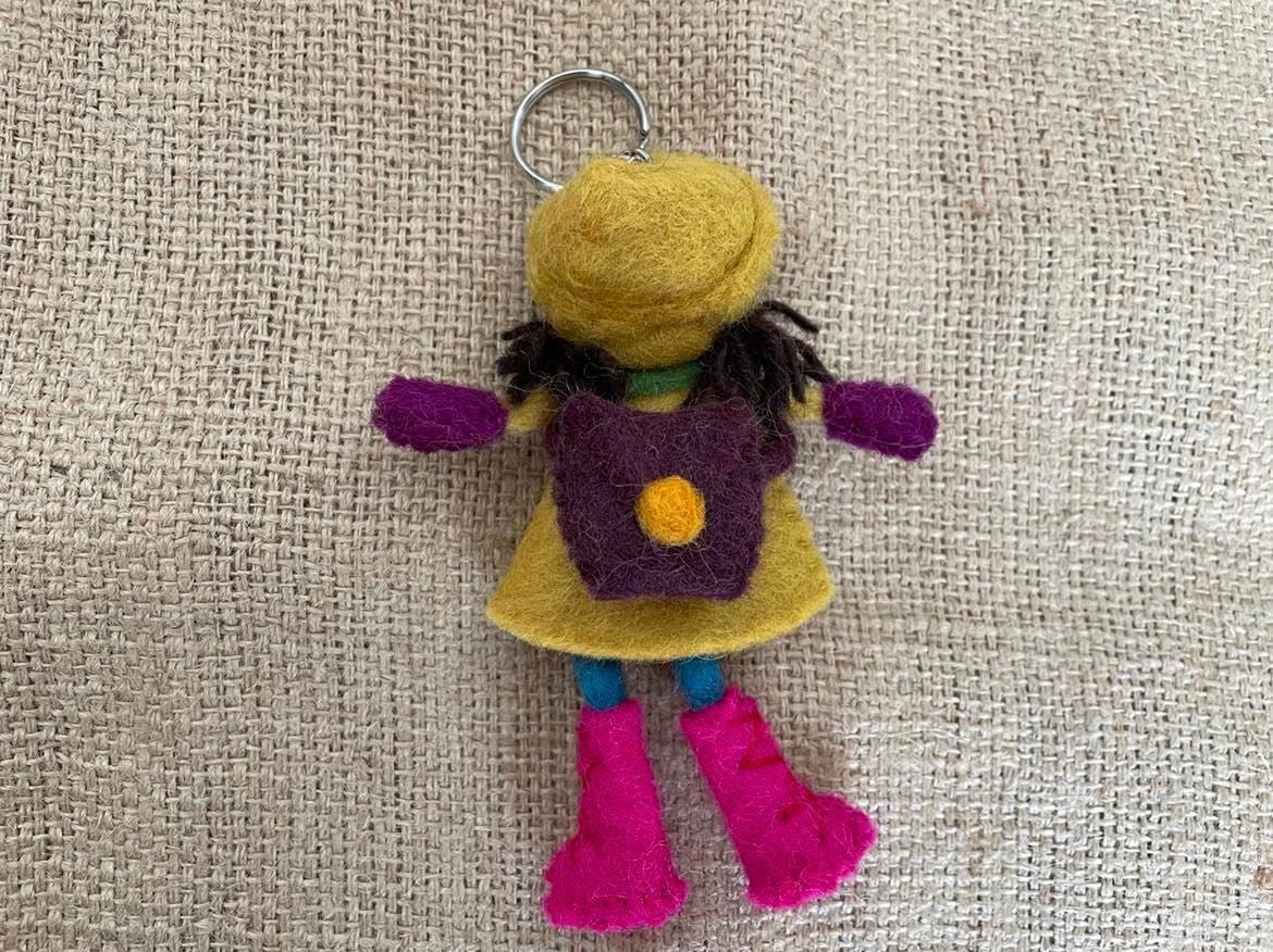 ネパール製フエルトのキーホルダーターメリックちゃんです。ドールは15センチ〜16センチ。手作りなので表情などがひとつひとつ微妙に違います。その旨ご了承ください。